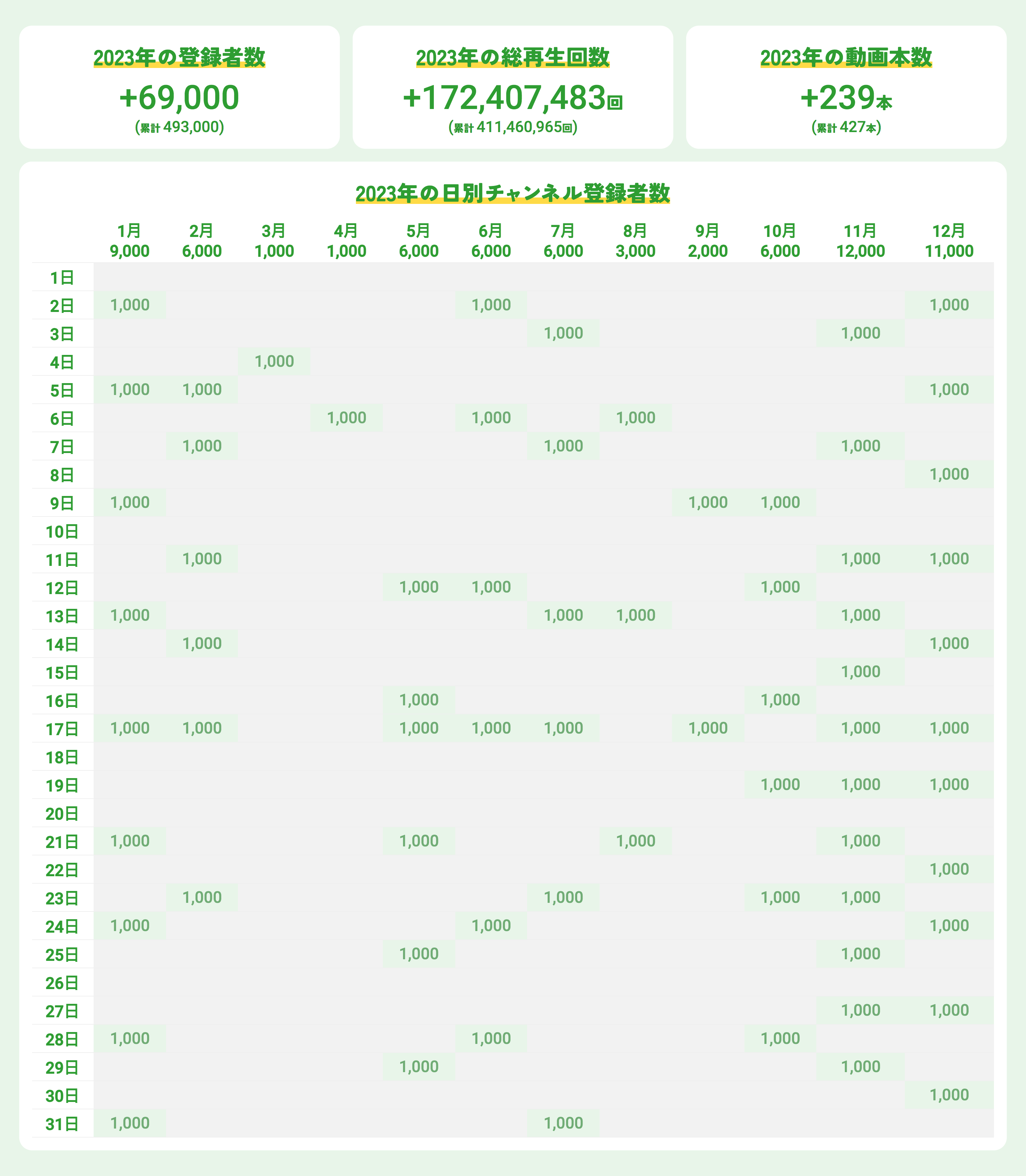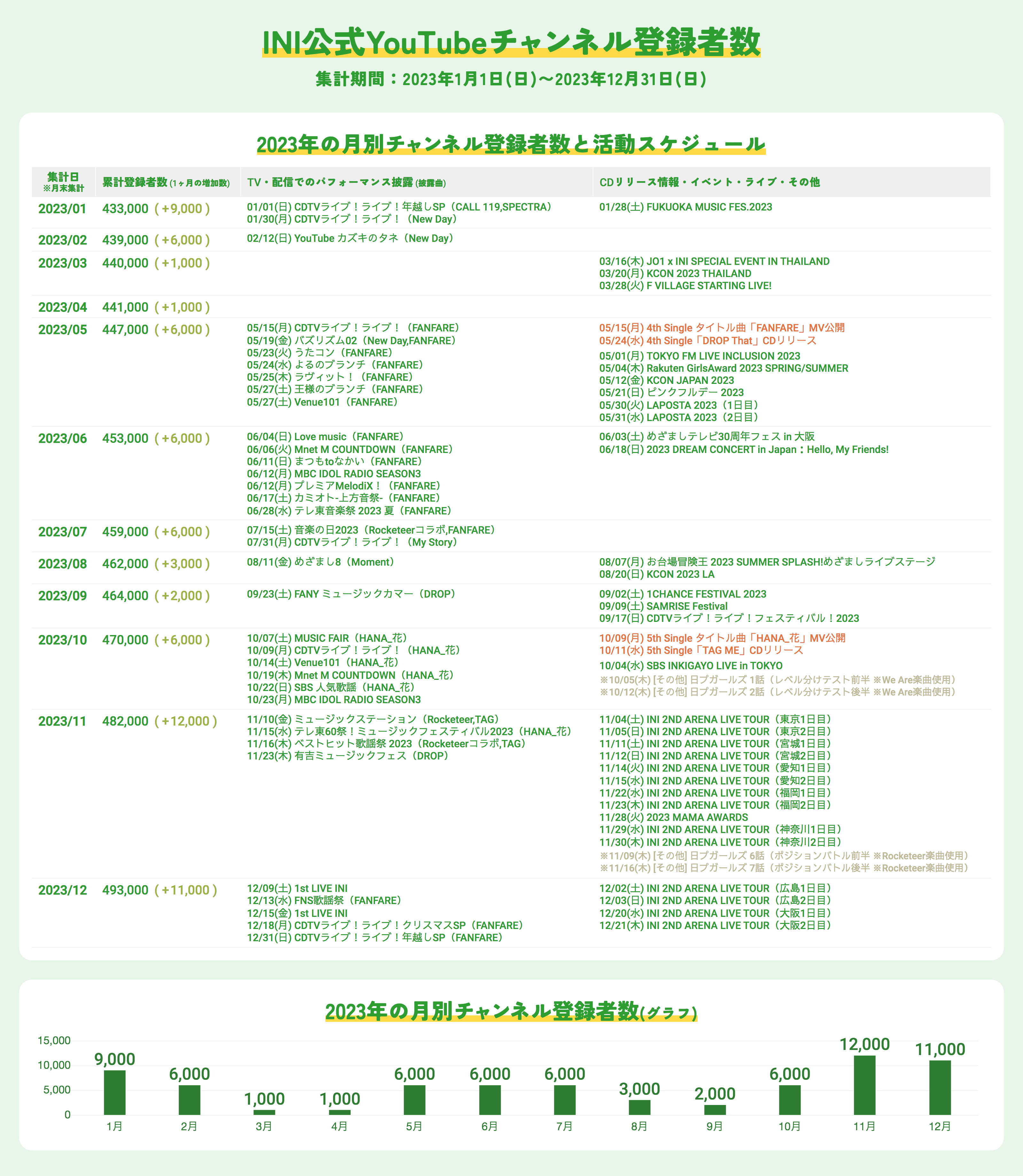 - INI公式YouTubeチャンネルのチャンネル情報ページに表示されているチャンネル登録者数・チャンネル総再生回数・動画本数を集計しています。